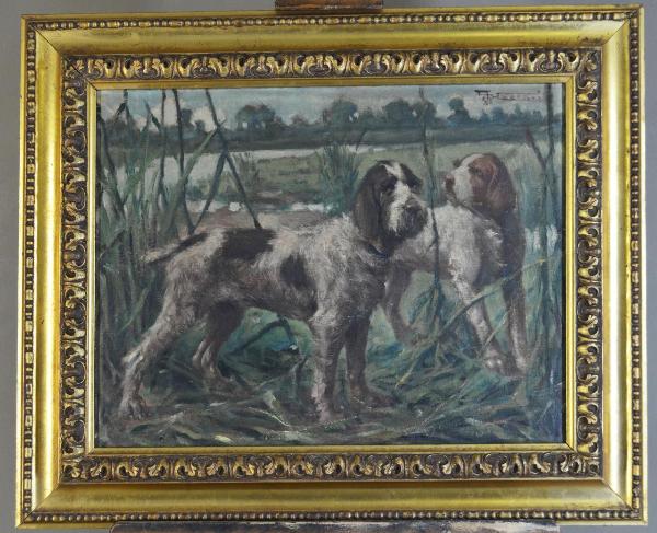 Dipinto ad olio e tempera su tela, montata su telaio ligneo espandibile, con incastri di tipo tenone mortasa a 1/3 di spessore, dotati di biette lignee, inserito in cornice lignea modanata e dorata.\nRaffigura in primo piano due cani da caccia circondati da un paesaggio verdeggiante, con alberi e corso d'acqua. Resa dell'umidità del luogo, il soggetto è risolto con tratti veloci e corposi di colore, accurato studio anatomico degli animali e ricerca espressiva nei musi raffigurati dei cani.