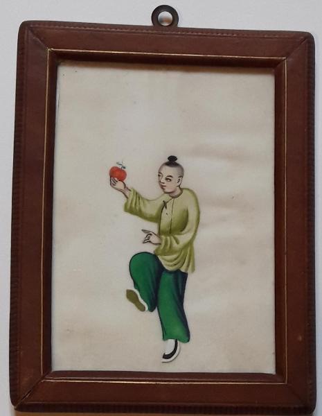 Pith paper cinese, con figura dipinta ad acquarello e tempera su un materiale ricavato dal midollo di una pianta orientale con una particolare consistenza spugnosa, rigida e delicata simile all’ostia.\nTraspare dall'opera una delicata raffinatezza nella resa del soggetto con colori vivaci e smaltati.\nIl dipinto è posto in una cornice in pelle con profilo dorato.\n\n
