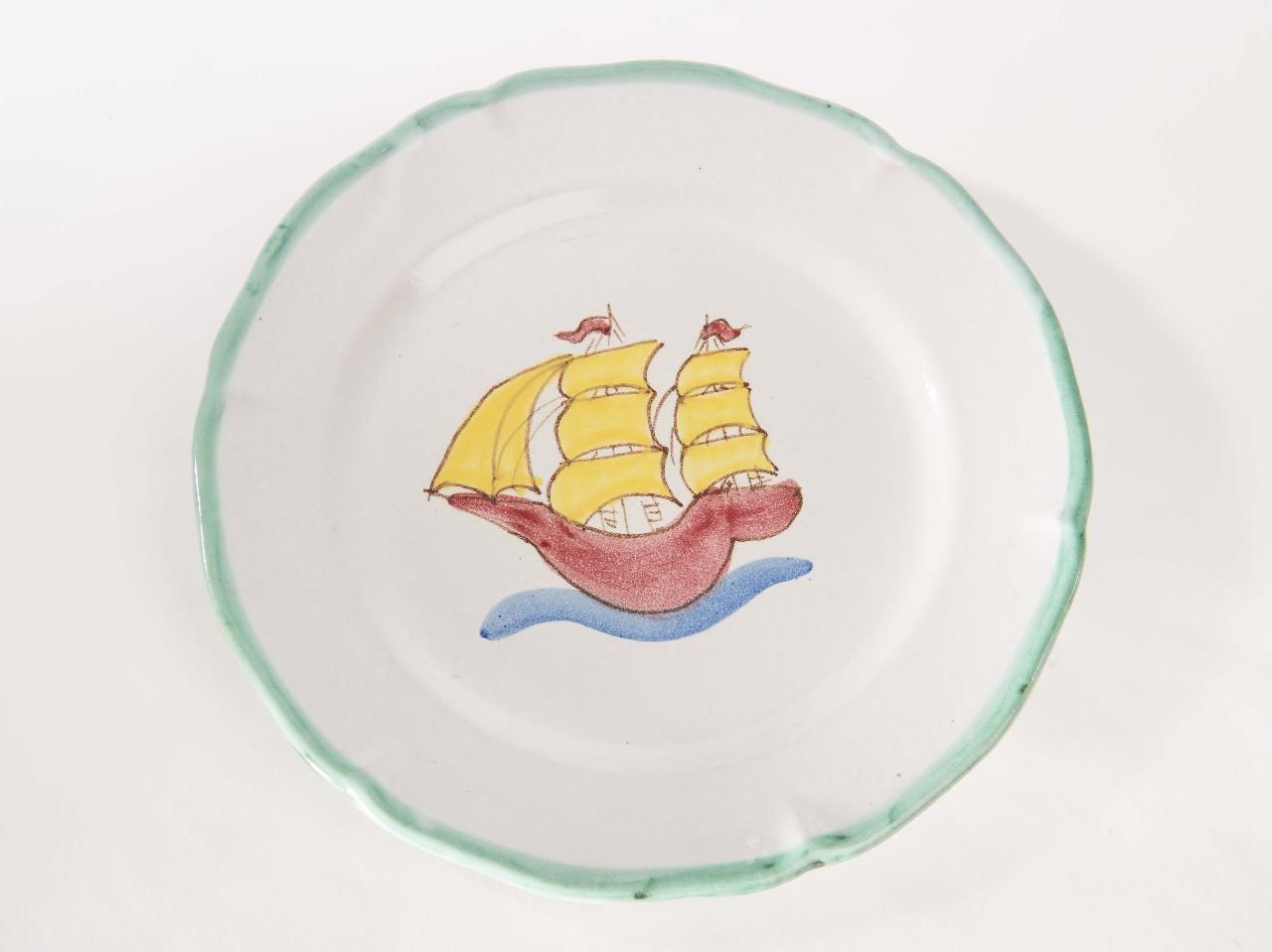 Serie di piatti in ceramica dipinti a mano, con bordo ondulato profilato in color verde, al centro raffigurazione di un veliero in mare.\nAbbiamo in tutto 23 piatti così suddivisi: 5 piatti fondi, 12 piatti piani, 6 piattini da dolce.