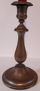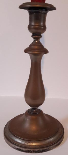 Candeliere in metallo fuso e argentato: base circolare, fusto con elementi decorativi torniti, bocciolo superiore in cui inserire la candela.\nIl manufatto presenta la patina originale scura del tempo.