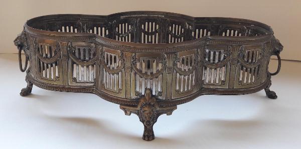 Centrotavola in metallo sbalzato e argentato, dalla forma polilobata, poggiante su quattro piedini leonini realizzati a fusione; ringhiera traforata ornata da lesene con capitello ionico, raccordate da festoni. Due prese laterali ad anello inserito in protome leonina.\nManca il recipiente asportabile interno, solitamente in cristallo o vetro.