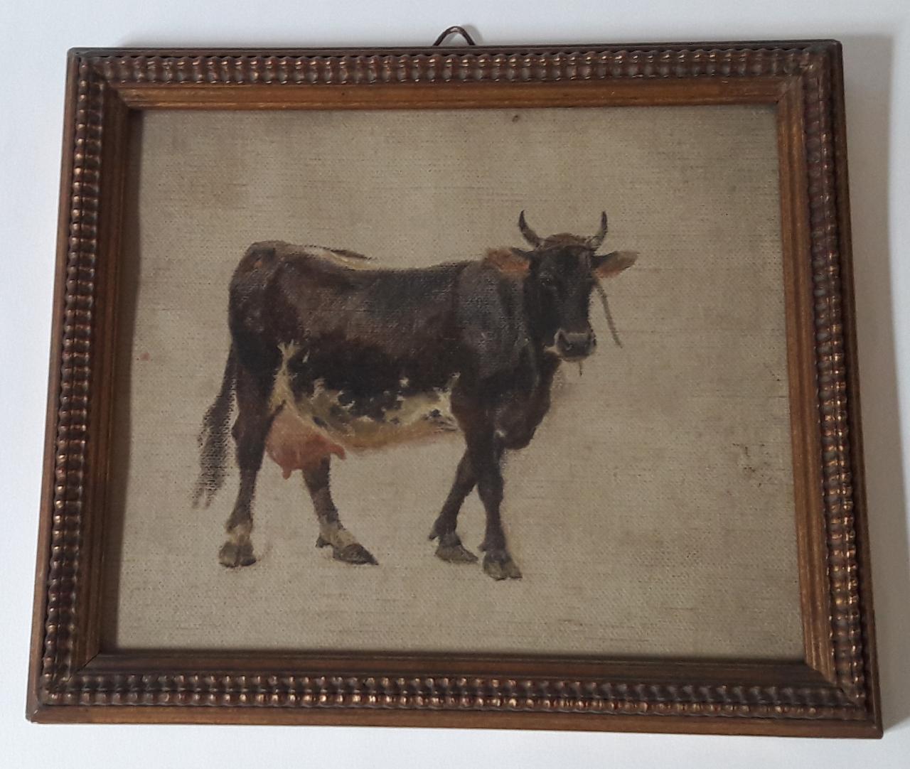 Dipinto realizzato a olio su tela, posto all'interno di una cornice in legno modanato e dorato.\nRaffigura al centro una mucca presa leggermente di 3/4 rivolta verso destra; contrasti tra luci e ombre, traspare la naturalezza del soggetto rappresentato reso attraverso una accurata esecuzione dei vari dettagli. \n