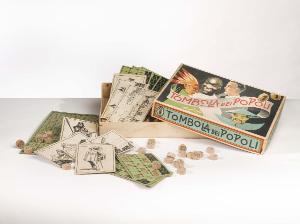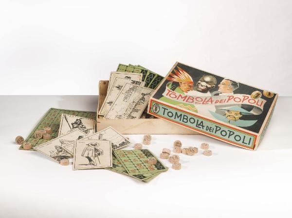 Gioco della Tombola dei Popoli, marchio Spiga. La scatola comprende 21 cartelle per tombola, cartellone con i 90 numeri e 90 numeri in legno marcato a fuoco.\n\n