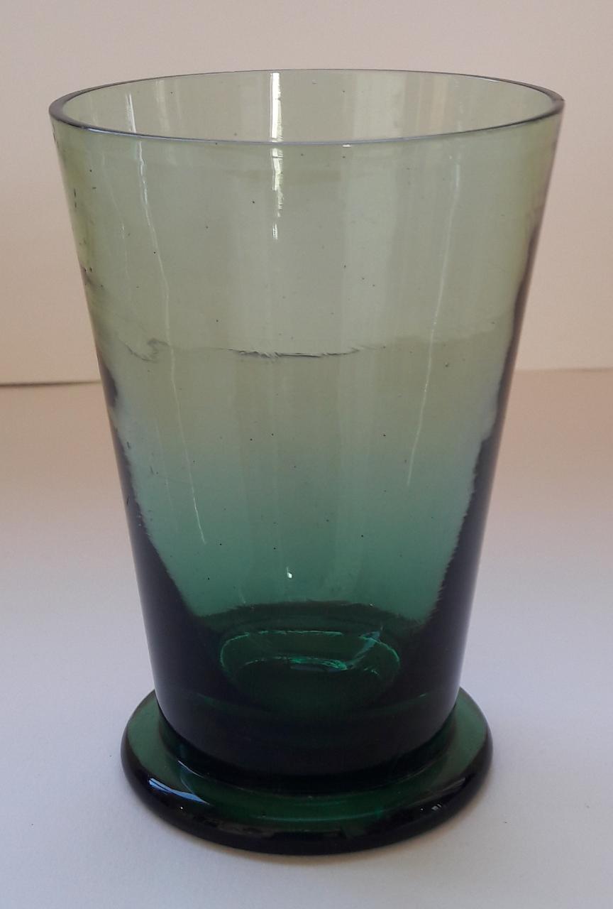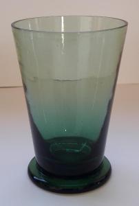 Bicchiere in vetro colorato verde, con base circolare e corpo a tronco di cono.\n\n