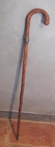 Semplice bastone formato da un fusto munito di puntale metallico nella parte inferiore e di un manico ricurvo nella parte superiore. Fascia decorativa in metallo con lavorazione a intreccio in prossimità del manico.
