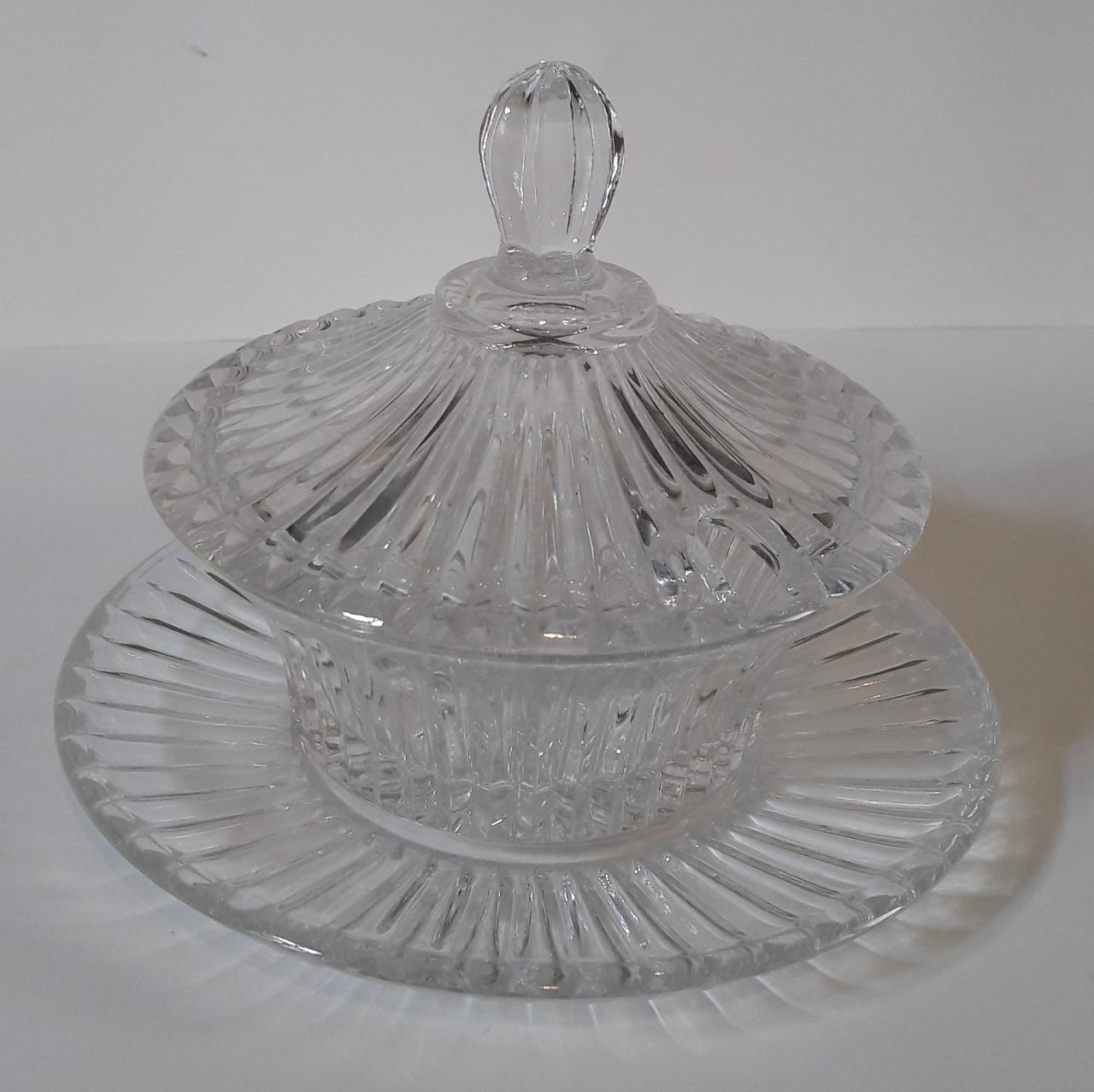 Formaggera in cristallo intagliato e molato composta da piattino, ciotola con mezzaluna per l`inserimento di un cucchiaino e coperchio con pomolo.
