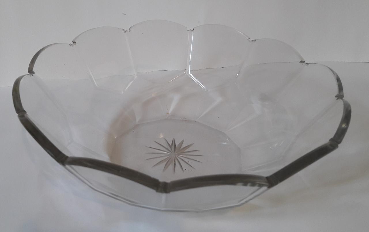Ciotola in cristallo sfaccettato e molato, con motivo decorativo a intaglio presente sulla base.