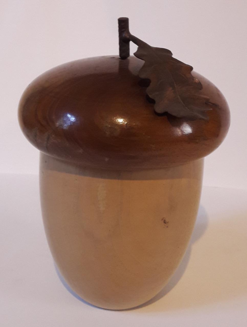 Barattolo con coperchio in legno a forma di ghianda, con picciolo e foglia di quercia in rame sbalzato.