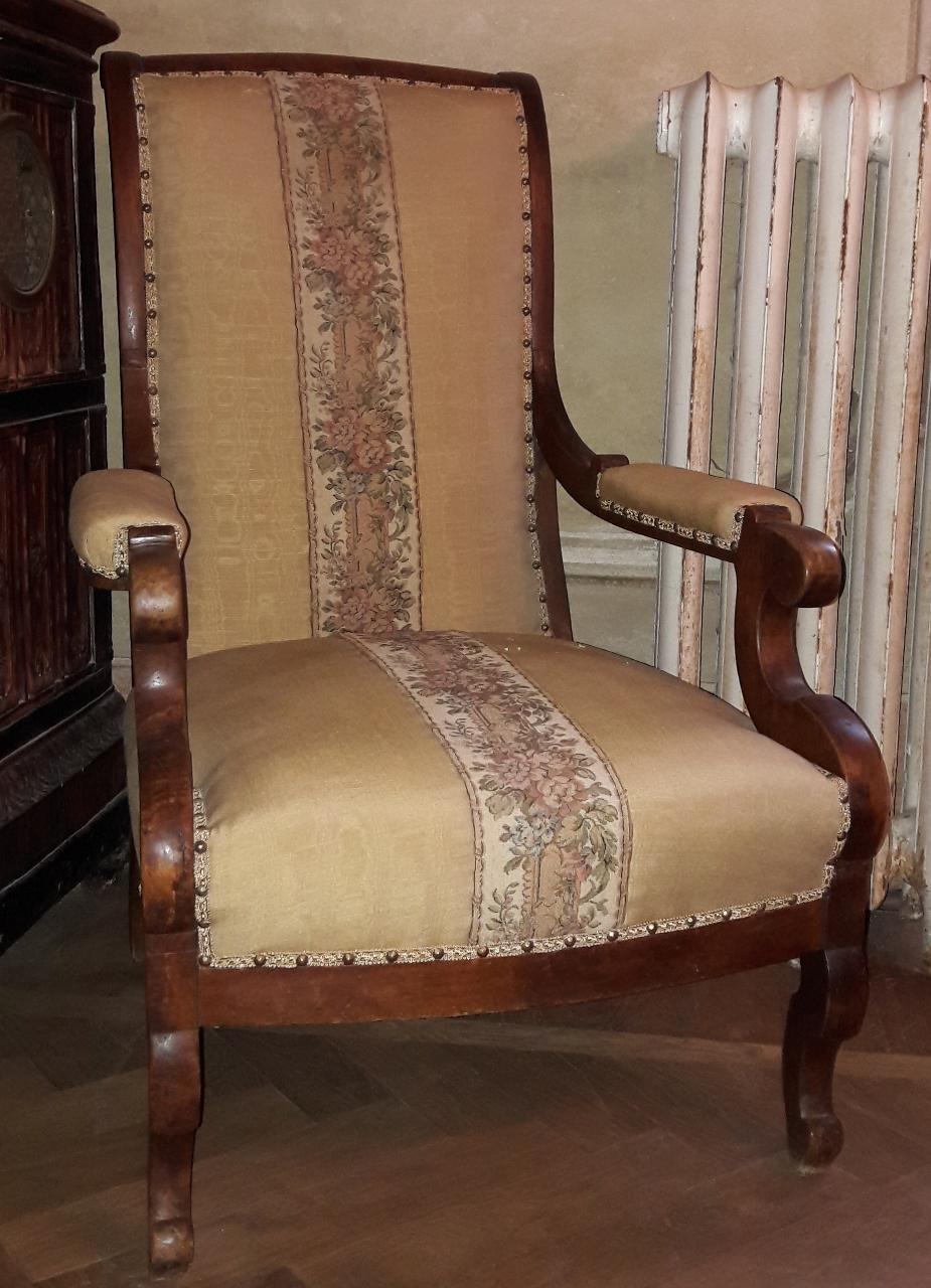 Poltrona a due braccioli con struttura portante in legno di noce massello, piedini e braccioli modanati; seduta e schienale sono imbottiti con rivestimento in tessuto pesante di cotone con fascia ornamentale al centro recante motivi decorativi floreali (gobelin).