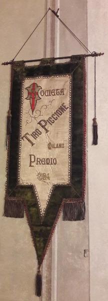 - NOTIZIE STORICO CRITICHE Lo stendardo è stato ricevuto da Giuseppe Macchi, nonno di Maria Luisa Macchi, come premio nel 1894; era infatti membro della Società di Milano del tiro al piccione, l’antenato del tiro al piattello.\nIn un documento della "Società del tiro al piccione di Milano" - anno 1912-1913 - tra i vari soci compare il nome di Giuseppe Macchi. \nIl tiro al piccione fu inventato in Inghilterra a inizio Ottocento con il nome di trapshooting come alternativa dopo il divieto di caccia degli uccelli selvatici sterminati dall'attività venatoria. E l'Inghilterra fu il primo paese a vietarlo nel 1922.\nAl piccione, prima di essere introdotto nella cassetta, viene tagliata la coda; affinché l'animale, volando improvvisamente privo del suo timone, e compiendo le più bizzarre evoluzioni, possa rendere più difficile l'esercizio del tiro.