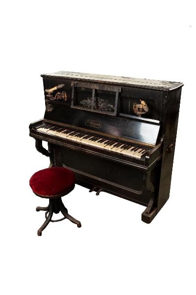 Pianoforte verticale G. Schwander - Parigi: la disposizione verticale riguarda sia la tavola armonica e le corde che stanno dietro alla tastiera.\nIl pianoforte è uno strumento musicale a corde percosse mediante martelletti, azionati da una tastiera.\nLa struttura è in legno laccato color nero, ornata da placche decorative in legno intagliato; la tastiera presenta tasti in avorio. Corredato da leggio, due applique e sgabello circolare.\n\n