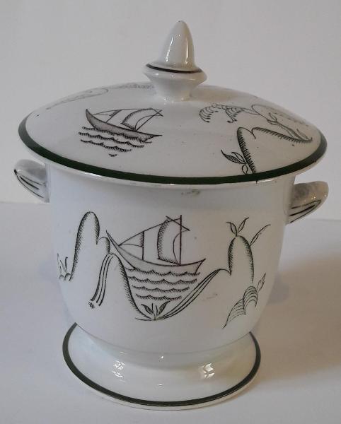 Zuccheriera a base circolare, con due piccoli manici e coperchio munito di pomolo; presenta motivi decorativi stilizzati, profilature in colore verde.