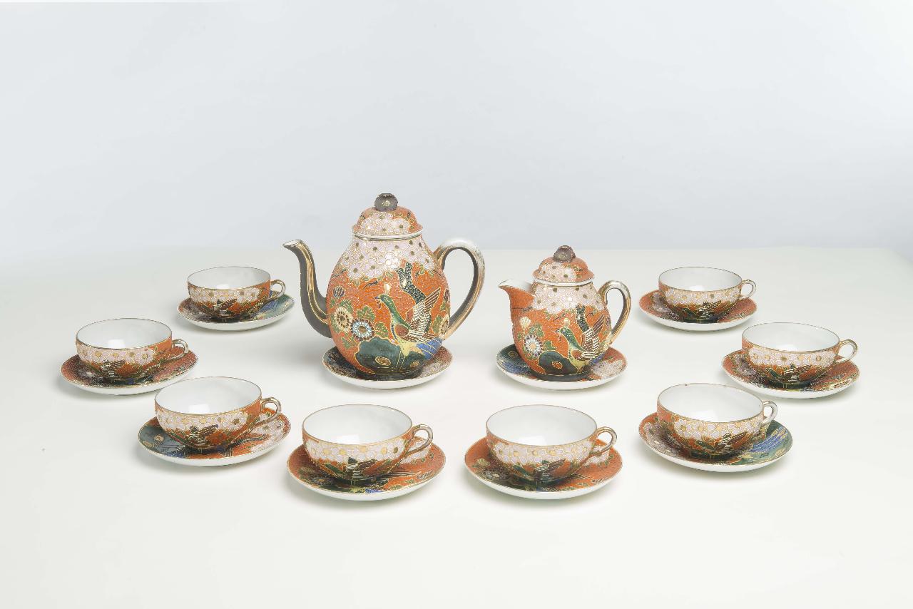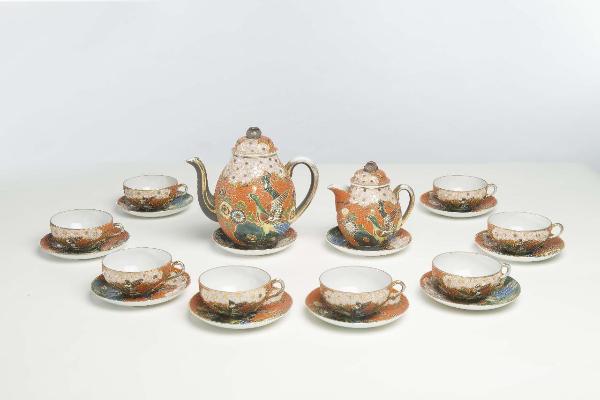 Servizio in porcellana orientale composto da una teiera, una lattiera, nove tazze da thè con relativo piattino e due piattini senza tazza.\nPresenta decori policromi: raffigura fiori e volatili su fondo arancio. Tra questi, si riconosce una coppia di anatre, animali che nella tradizione orientale sono simbolo di buon auspicio per l’unità e la fedeltà della coppia.\nIn parte la decorazione è eseguita con la tecnica del moriaggio: si tratta di una decorazione a rilievo su porcellana e ceramica giapponese realizzata stratificando argilla diluita (slip) sulla superficie del corpo ceramico.\nIl servizio reca, sotto tutti gli elementi, il marchio Shimazu Maruni.