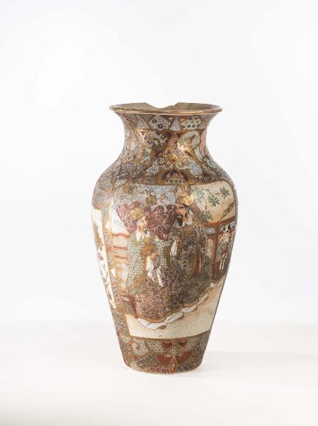 Grande vaso dipinto a mano con figure orientali e motivi decorativi policromi.\nIn parte la decorazione è eseguita con la tecnica del moriaggio: si tratta di una decorazione a rilievo su porcellana e ceramica giapponese realizzata stratificando argilla diluita (slip) sulla superficie del corpo ceramico.\nTraspare dal manufatto la vivacità e la bellezza della pittura, con colori intensamente vividi, arricchita da scintillanti dettagli dorati.\n\n