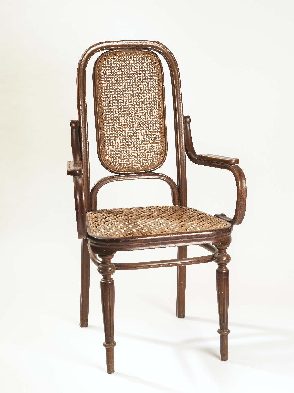 Poltroncina che poggia su quattro gambe: tornite, intagliate e a sezione circolare quelle anteriori, dal profilo leggermente sinuoso quelle posteriori, unite tra loro da traverse tubolari. La seduta ha il bordo modanato ed è foderata in canna d'India intrecciata, detta "paglia di Vienna". Lo schienale presenta un'intelaiatura lineare, creata da due canne di faggio laterali che proseguono nelle gambe posteriori scaricando così il peso a terra; si uniscono quindi a una canna nella parte superiore e a una canna curvata nella parte inferiore in modo tale da contenere il pannello incannucciato di forma rettangolare con angoli smussati, che costituisce lo schienale. I braccioli sono costituiti da due canne piegate.\n\n