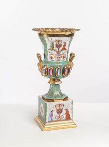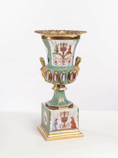 Coppia di vasi con manici dipinti a mano, poggianti su un basamento quadrangolare, modanato nella parte inferiore, fusto sfaccettato, corpo del vaso a forma di cratere, ornato alla base con motivi decorativi plastici a cabochon e mascheroni dorati in prossimità dell'attaccatura dei manici al corpo del vaso; bordo superiore dentellato.\nPresenta un ricco e raffinato apparato decorativo policromo e dorato su fondo verde e bianco, dato da figure di angeli, animali, motivi ornamentali floreali e vegetali, composizioni di invenzione (sorta di medaglioni con all'interno nature morte). Profilature dorate.