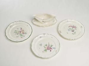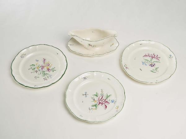Servizio da tavola in terraglia forte ornata con motivi decorativi floreali e insetti realizzati con la tecnica della decalcomania ritoccata a mano, a piccolo fuoco.\nI vari pezzi del servizio hanno la tesa ondulata e bordo leggermente arcuato e modellato con una profilatura incisa e in colore verde; i fondi\nbianco avorio, presentano un mazzo di fiori policromo e piccoli insetti in posizione decentrata sul fondo e piccoli tralci fioriti lungo la tesa.\nIl servizio è composto da: 2 piatti fondi, 26 piatti piani, 12 piattini da dolce, 2 salsiere, 4 ciotoline, 1 vassoio da portata ovale (cm. 41 x 30), 1 raviera, 2 ciotole ovali, 2 vassoi da portata ovali (cm. 35.5 x 27.3), 1 vassoio da portata ovale (cm. 27 x 21.5), 1 risottiera, 1 vassoio da portata ovale per il pesce.\nSotto il fondo di vari pezzi del servizio compaiono le lettere "A" e "B": si riferiscono ad Adele Bottelli, nonna di Maria Luisa Macchi.\nSotto la base del vassoio da portata ovale per il pesce compare la scritta "A BOTTELLI", sempre riferibile ad Adele Bottelli.\n\n\n\n