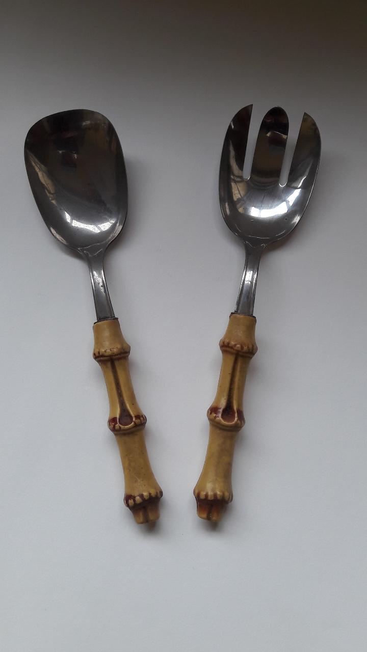 Set di posate da portata con manico in bachelite imitante il bambù e la restante parte in acciaio inossidabile.\n\n\n