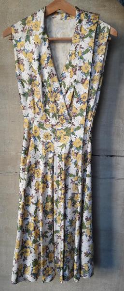 Abito femminile da sartoria senza maniche per la stagione estiva, in seta stampata con vivaci motivi decorativi floreali, corredato dalla sua cintura en pendant.\n\n