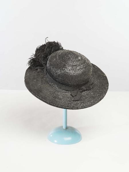 Cappello da donna in paglia color nero finemente lavorata a tesa larga con nastro e fiocco in cotone, guarnizione con piume di struzzo.\nLa tesa del cappello è bordata in cotone. Il cappello ha all’interno la sua etichetta originale: “Walder Varese".\n\n