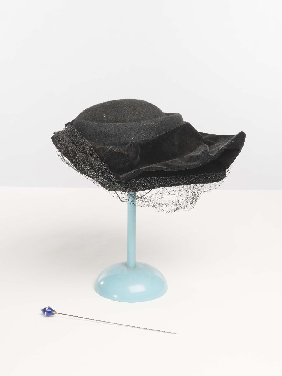 Cappello da donna in velluto e panno con veletta e spillone, guarnizioni interne in cotone.\n Il cappello ha all’interno la sua etichetta originale: “Walder tel. 2564 Varese".\n\n