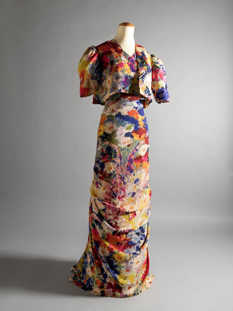 Il completo è composto da abito e bolero. L'abito intero, di linea aderente, è senza maniche e presenta un taglio in vita sagomato che sul davanti arriva sopra il seno. Nella parte anteriore, il corpetto è confezionato in due parti, arricciate lungo il taglio a vita alta, che formano un breve scollo a punta. Sulla schiena si apre in una profonda scollatura a punta. La gonna e la parte anteriore sono in due teli modellati con pinces. La parte bassa dell'abito è percorsa da un drappeggio orizzontale che viene ripreso sul dietro dove origina una cascata di pieghe sciolte e un breve strascico. L'allacciatura è costituita da una cerniera, coordinata con una delle tinte del tessuto, cucita al centro dietro. Il bolero a un petto, in tre teli, presenta una profonda scollatura a punta sul davanti ed è privo di allacciatura. Le maniche al gomito sono a palloncino.