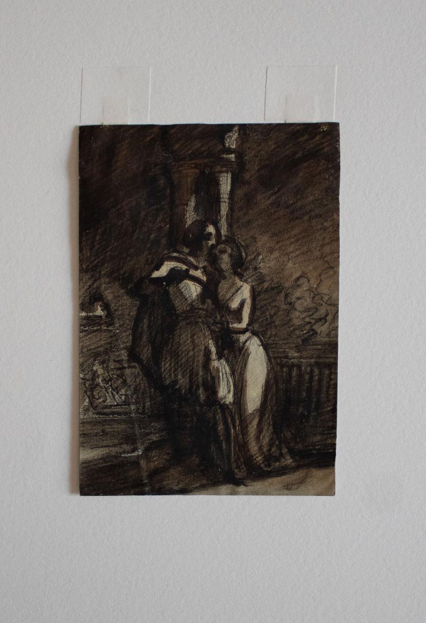 - NOTIZIE STORICO CRITICHE L'opera è da considerarsi uno studio preparatorio per un dipinto commissionato nel 1847 da Marozzi, mai portato a termine dal Massacra. Il disegno raffigura Filippone che, accettato l'incarico di uccidere frate Bossolato, desiste grazie all'intervento della moglie. \nIl dipinto con lo stesso soggetto (inv. 81) giunge ai Musei civici di Pavia per legato di Giovanni Carlo Francesco Reale nel 1892. L'opera non fu mai portata a termine e pertanto non partecipò all'esposizione di Brera per la quale era stata pensata.