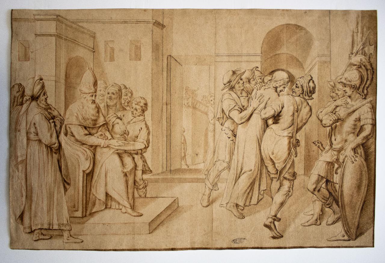 La scena è suddivisa in due gruppi e vede all'estrema destra il Cristo, con mani legate, scortato dai soldati dopo il giudizio di Ponzio Pilato, momento che segna definitivamente la condanna di Cristo. \nA sinistra l'autore fissa sul foglio il momento emblematico del lavaggio delle mani, simbolo della decisione di Pilato posto su quello che sembra un trono. Il tribunale, luogo nel quale si svolge la scena, è accennato attraverso semplici strutture architettoniche, sono visibili difatti delle alte mura, un arco e delle finestre. \n