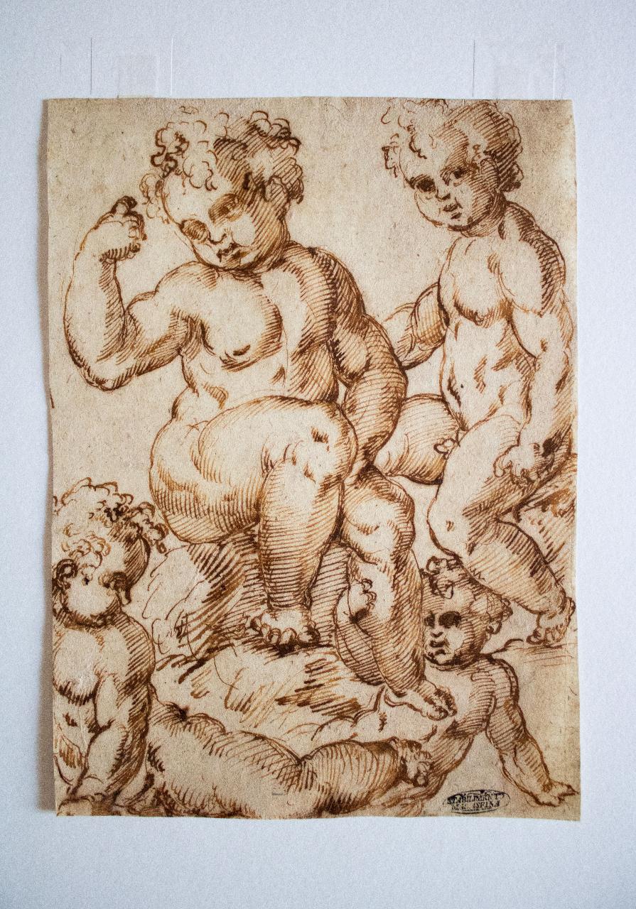 - NOTIZIE STORICO CRITICHE Il foglio pavese, di eccelsa fattura, è da attribuire a Baccio Bandinelli(1488-1560), databile alla prima metà del Cinquecento difatti il disegno può trovare confronto con i numerosi studi di putto attribuiti all'artista o alla sua bottega. In particolare si segnala un foglio facente parte della collezione di disegni della Galleria Estense di Modena (inv. 867) dalla quale emergono chiaramente i modi grafici dell'artista.\n