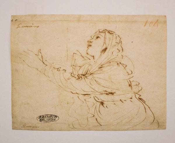 - NOTIZIE STORICO CRITICHE La firma sul foglio posta sul recto in alto e in basso a sinistra attribuisce il foglio al Guercino. \nGiovanni Francesco Barbieri nacque nel 1591 nei pressi di Ferrara e deve il suo soprannome ad un problema agli occhi. La sua formazione fu influenzata da maestri emiliani quali Bartolomeo Bertozzi da Bastiglia (Modena), Benedetto Gennari da Cento e il quadraturista Paolo Zagnoni. Ancora più forte ed evidente è l'influenzata di Ludovico Carracci, B. Schedoni e Scarsellino da Ferrara.\nProprio grazie ai consigli del Carracci tra il 1615-17 il cardinale Alessandro Ludovisi acquistò tre dipinti con gli Evangelisti e la Resurrezione di Tabita ora nella Galleria Pitti. Negli stessi anni il Guercino affrescò la Lotta di Ercole con l'Idra nel palazzo Tanari a Bologna. \nSecondo il Malvasia, la sua bottega era quella più frequentata, tanto da contare sulla presenza di ben ventitré allievi. Il disegno pavese è da considerare uno studio di figura preparatoria per una composizione più ampia, forse una presentazione al tempio. L'opera dimostra piena padronanza del mezzo grafico e ampia abilità nel disegno.