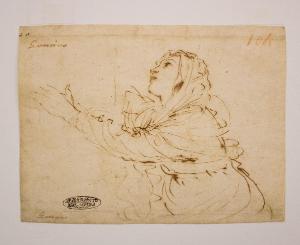 Il foglio ritrae una figura femminile di tre quarti. La giovane donna con il capo coperto da un velo potrebbe essere la Vergine Maria con le braccia protese a sinistra come se stesse sorreggendo un peso. La donna indossa ampi abiti femminili cinti in vita. Il segno grafico è veloce ma rende con precisione i dettagli fisionomici restituendo alla figura un'espressione delicata e soave.
