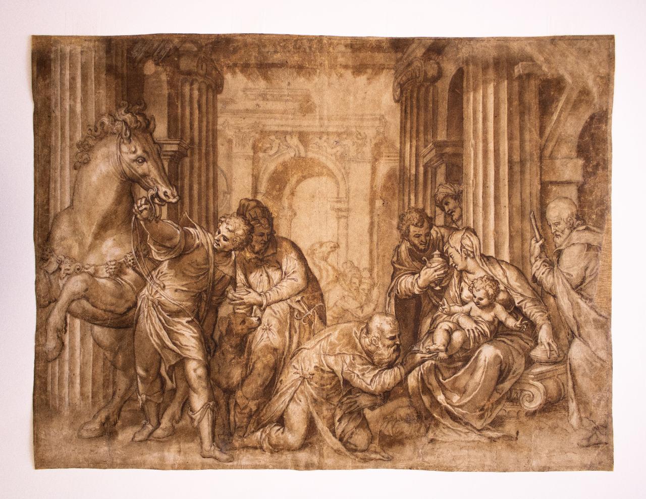- NOTIZIE STORICO CRITICHE Il disegno storicamente attribuito a Paolo Farinati è stato giustamente messo in dubbio dalla Tordella, che ne riconosce i limiti dell'esecuzione. La composizione è in strettissima relazione con una tela eseguita dal pittore veronese, che ebbe molta fortuna tra i suoi committenti; tant'è che il pittore ne dipinse svariate repliche. La prima versione dovrebbe essere stata eseguita poco dopo il 1562. Una redazione più tarda è conservata presso il Museo di Castelvecchio di Verona ed è datata dalla critica al 1574. Una ancora successiva si trova al Rijksmuseum di Amsterdam, ed è databile al 1585.