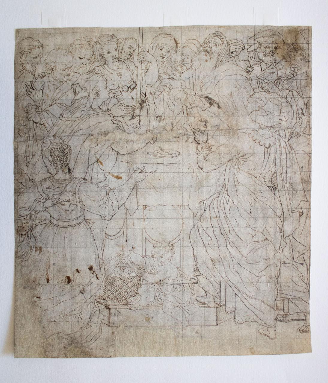 - NOTIZIE STORICO CRITICHE \nIl disegno, tipico dello stile del Chiaveghino, è lo studio preparatorio per l'omonimo dipinto eseguito nel 1600 nella Cappella del Sacramento del Duomo di Fidenza. Rispetto alla tela il foglio manca della parte superiore, in cui si sviluppa la spazialità della scena, inserita all'interno di un'architettura con il punto di fuga centrale e inquadrata da due colonne ed un arco nel fondo.