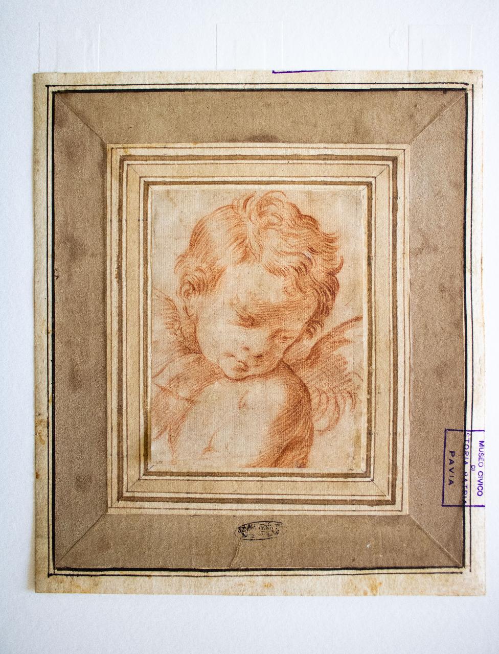 Un volto di angioletto con le spalle rivolte verso sinistra e il viso inclinato verso il basso girato nella direzione opposta. Le piccole ali velocemente abbozzate