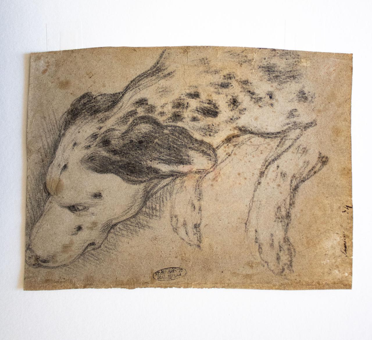 - NOTIZIE STORICO CRITICHE \nIl disegno denota una certa sapienza nell'uso spigliato del carboncino modulato a seconda delle parti dell'animale da rappresentare. Sottile e controllato nelle linee in corrispondenza del muso, il segno si allarga leggermente nella veloce e fluida resa delle zampe per aprirsi completamente nel descrivere le chiazze del manto. \nLe due scuole che hanno fatto un largo e sapiente utilizzo di questa tecnica sono quelle bolognesi e venete. Un'indagine in questi due ambiti potrebbe portare alla comprensione del nome dell'autore. Per la resa lievemente irrigidita di alcuni particolari del muso dell'animale sarebbe consigliabile non escludere che possa trattarsi di una copia dell'epoca.