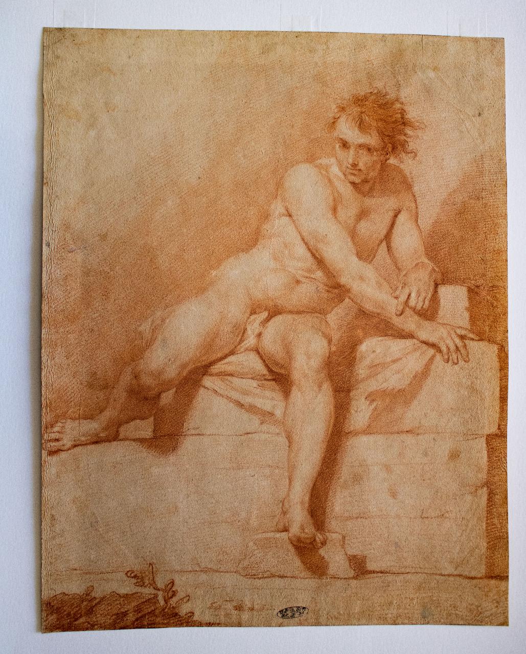 Una figura maschile ignuda siede su un masso, la gamba destra piegata. L'equilibrio è mantenuto dal gomito sinistro e dalla mano destra, entrambe poggiate alla roccia.
