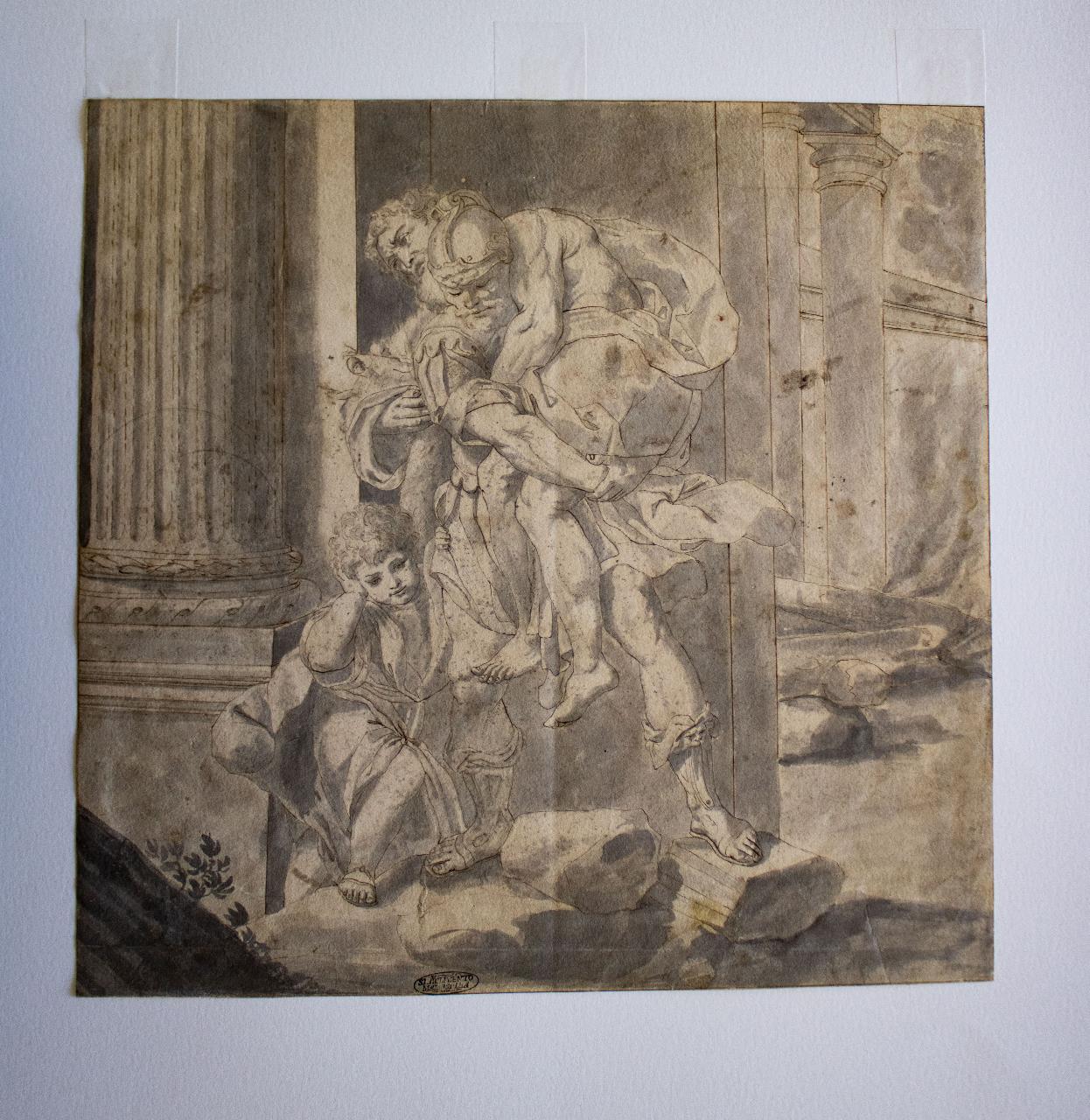 Un soldato trasporta tra le sue braccia un uomo seminudo. Sulla sua sinistra è accompagnato da un fanciullo. Sullo sfondo si scorgono delle colonne.\n