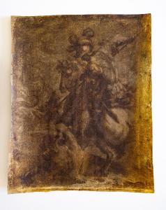 A cavallo di un possente destriero un soldato trafigge con la sua lancia un mostruoso drago.