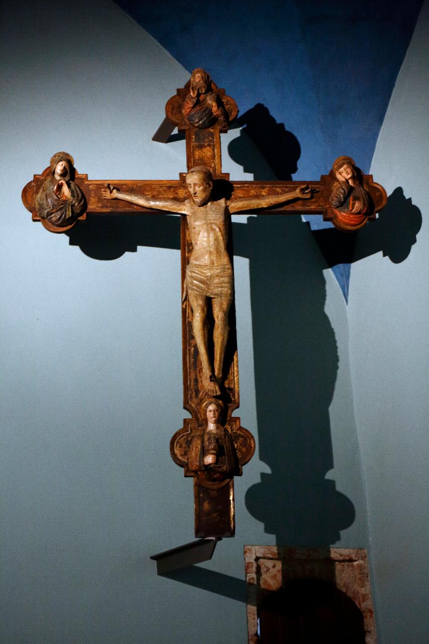 Cristo crocefisso. Ai lati della croce vi sono quattro medaglioni polilobati che comprendono in alto la figura di Dio padre, a destra San Giovanni, a sinistra la Vergine, in basso Santa Maria Maddalena.\nSul retro Cristo dipinto e datato 1576 con motivi simbolici alle quattro estremità.