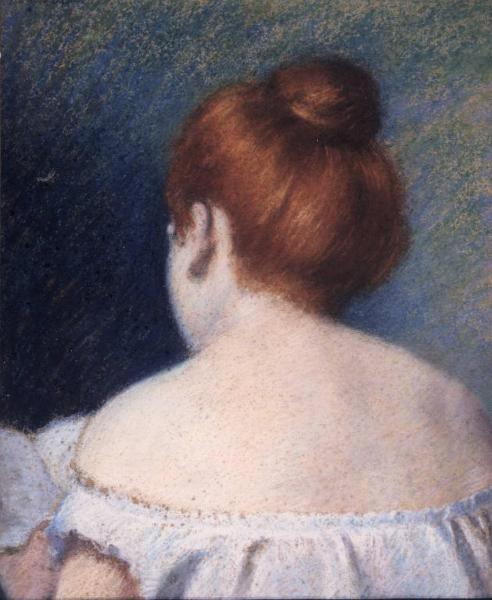 - NOTIZIE STORICO CRITICHE Il tratto del pastello è striato nello sfondo, mentre nella figura si osserva un ductus più morbido e conchiuso. Il rosso dello chignon è esaltato dal complementare blu dello sfondo e prende luce dal candore dell'incarnato e della camiciola. Nel pastello, Zandomeneghi raggiunge i massimi livelli espressivi, rivaleggiando con Degas.