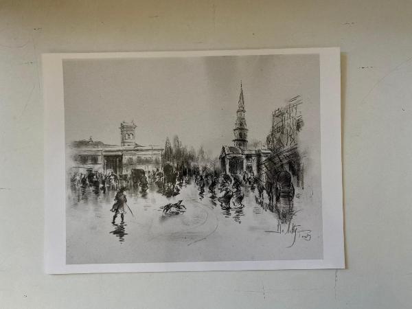 - NOTIZIE STORICO CRITICHE Il disegno suscita qualche dubbio circa l'autenticità: nonostante l'indicazione "Paris" che segue la firma, anch'essa non attendibile, si tratta di una veduta di Trafalgar Square a Londra, che trova un preciso riscontro con lo studio a olio della piazza, iniziato nel 1876, e inviato all'Esposizione Universale di Parigi del 1878. Rispetto allo studio ad olio su tela, manca il monumento a sinistra e il lampione in primo piano. Inoltre, il tratto a carboncino appare troppo spezzato rispetto alla grafica dell'artista.