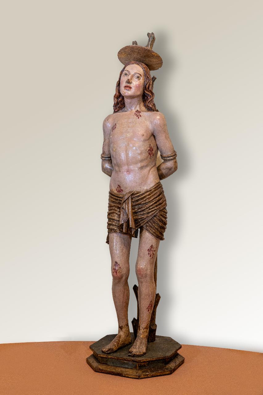 - NOTIZIE STORICO CRITICHE Come la Madonna orante e il San Giovanni Battista, anche la statua di San Sebastiano, faceva parte del cosiddetto “Trittico dei Disciplini” in origine posto sull’altare marmoreo della Disciplina di Castel Goffredo dedicata a San Giovanni Battista. In particolar modo il volto presenta geometrie identiche e la stessa dilatazione delle superfici del viso della Madonna orante. Appare inoltre manifesto il confronto tra il santo goffredese e quello dipinto da Andrea Mantegna conservato al Louvre, prossimo alla Pala di San Zeno (1459), come dimostrano l’identica definizione anatomica dei due santi, la doppia legatura delle braccia sopra i gomiti, la bocca dischiusa e lo sguardo trasognato verso il cielo. La presenza di tre sculture (Madonna orante, San Giovanni Battista, San Sebastiano) di alta qualità, in origine nel medesimo luogo, suggerisce che la confraternita dei Disciplini volle lasciare un segno tangibile e perenne dei valori in cui credeva e nei quali si identificava, quelli di una comunità sensibile al culto, ai valori civili e alla bellezza artistica. L’ambito di produzione della scultura è da identificare con quello veronese di una bottega senza dubbio prossima a quella di Giovanni Zebellana o dei Giolfino, considerati tra i maggiori interpreti dell’arte mantegnesca nel legno.