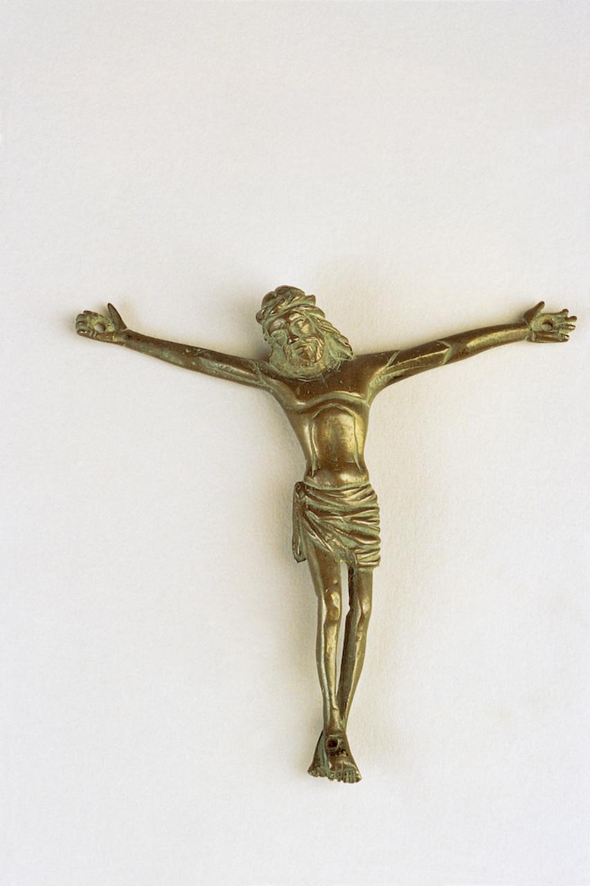 L’opera è di piccole dimensioni e si presenta mancante del supporto ligneo della croce. Sono presenti quattro fori in corrispondenza di mani e piedi. Da notare il particolare del piede destro dotato di sei dita. Piuttosto semplificato è il disegno anatomico che attraverso semplici linee costruisce la tensione delle braccia e lo sviluppo della zona addominale.