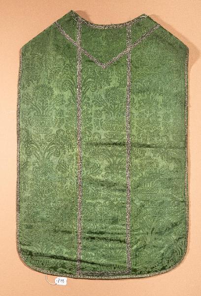 - NOTIZIE STORICO CRITICHE Il tessuto utilizzato per confezionare la pianeta, tranne quello impiegato nella colonna centrale anteriore, è ascrivibile ad una tipologia decorativa attestata prevalentemente nei damaschi monocromi, presente con continuità nella produzione tessile italiana a partire dalla seconda metà del XVI secolo fino a tutto il secolo successivo . La tipologia del vaso e dell’anfora, reiterata soprattutto nei decenni successivi alla fine del Cinquecento, viene impiegata in tessuti che subiranno definitive trasformazioni d’uso passando da un utilizzo iniziale per l’abbigliamento liturgico ad uno successivo per stoffe di arredamento. Diversamente, il tessuto utilizzato nella colonna centrale anteriore, presenta un motivo decorativo detto "a mazze", in uso dagli ultimi due decenni del XVI secolo fino agli anni Trenta-Quaranta del secolo successivo. Questi ultimi motivi domineranno la produzione tessile destinata all'abbigliamento. In conformità alla moda del tempo, che proponeva abiti realizzati con teli di dimensioni piuttosto ridotte, si assiste a una repentina riduzione del modulo disegnativo non altrimenti leggibile nella sua totalità. Da qui la scelta per soggetti di piccole dimensioni spesso a carattere geometrico come nel caso in esame.\n