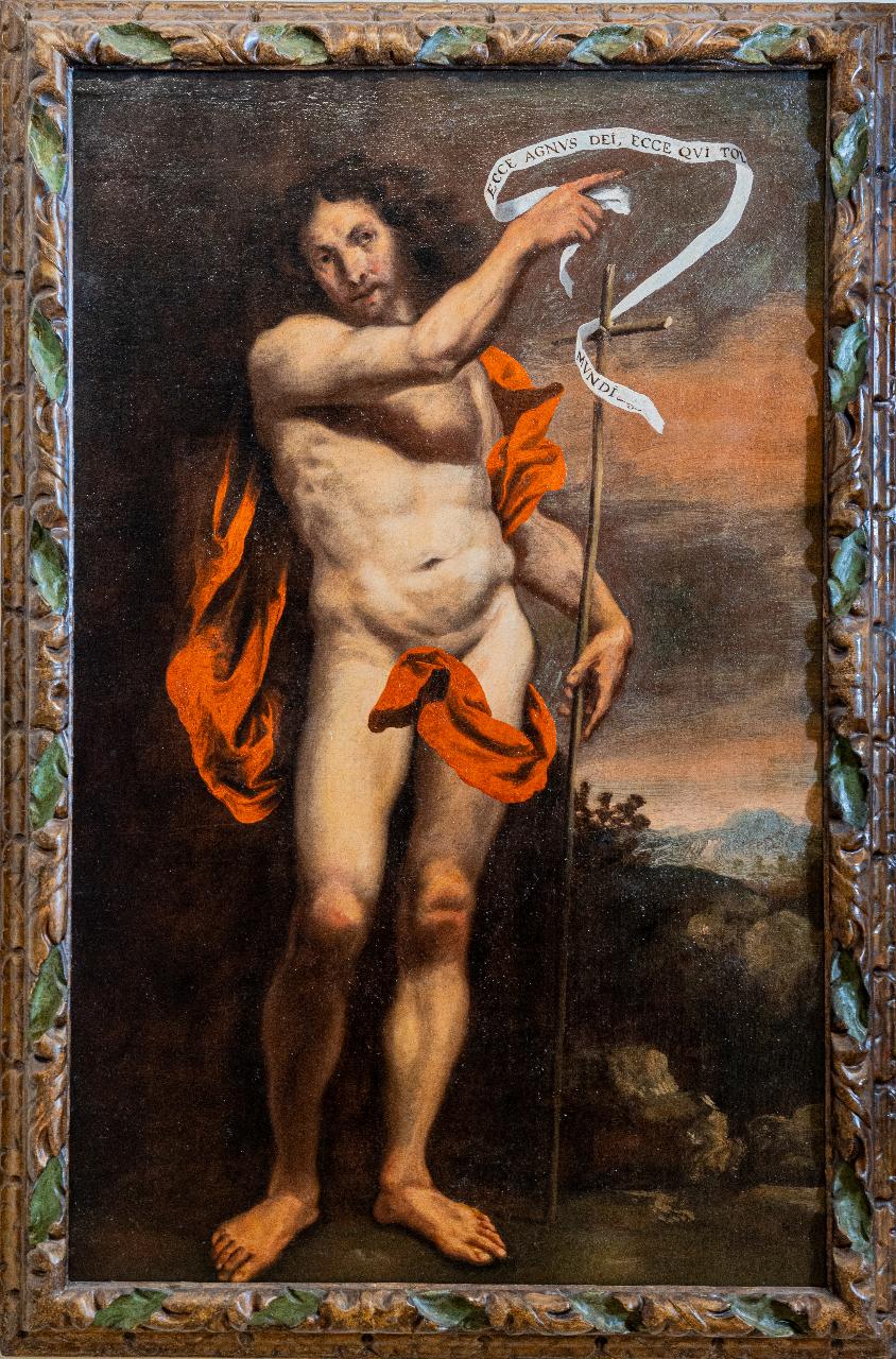 La tela di formato rettangolare è interamente occupata dalla figura adulta di san Giovanni Battista ritratto in posa chiastica. Il santo è riconoscibile dalla croce fatta di canne recante l’iscrizione “ECCE AGNUS DEI, ECCE QUI TOL [LIT PECCATUM] MUNDI” mentre il corpo è parzialmente ricoperto da un lembo del luminoso drappo rosso svolazzante. Sullo sfondo si intravede un paesaggio prevalentemente roccioso sormontato dal cielo tinto di rosso. Il dipinto è inserito entro una cornice lignea intagliata con motivi a foglie dorate e verdi (NCTN 00149099-2006).\n\n