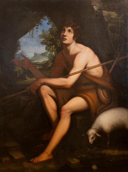 - NOTIZIE STORICO CRITICHE Fino al suo trasferimento in museo, il dipinto era conservato nella sagrestia nuova della chiesa prepositurale di Sant’Erasmo v.m. a Castel Goffredo e per ora non è stato possibile risalire alla sua ubicazione originale. La tela è stata rifoderata e non è più possibile leggere l’iscrizione sul retro della tela originale che indica l’anno “1644”, compatibile con la data di esecuzione dell’opera. Dal punto di vista stilistico quest’ultima ripete schemi tardo-manieristici consolidati. La modulata partizione tra luce e ombra, che rende ancora più corposa la fisicità del Battista nonché l'accurata trattazione dei particolari naturalistici, rivelano una personalità artistica non priva di un certo carattere.