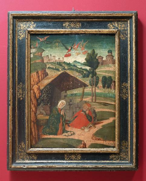 Personaggi: Madonna in preghiera, Gesù bambino, San Giuseppe, tre angeli. Altro: cartiglio "Gloria in excelsis Deo".