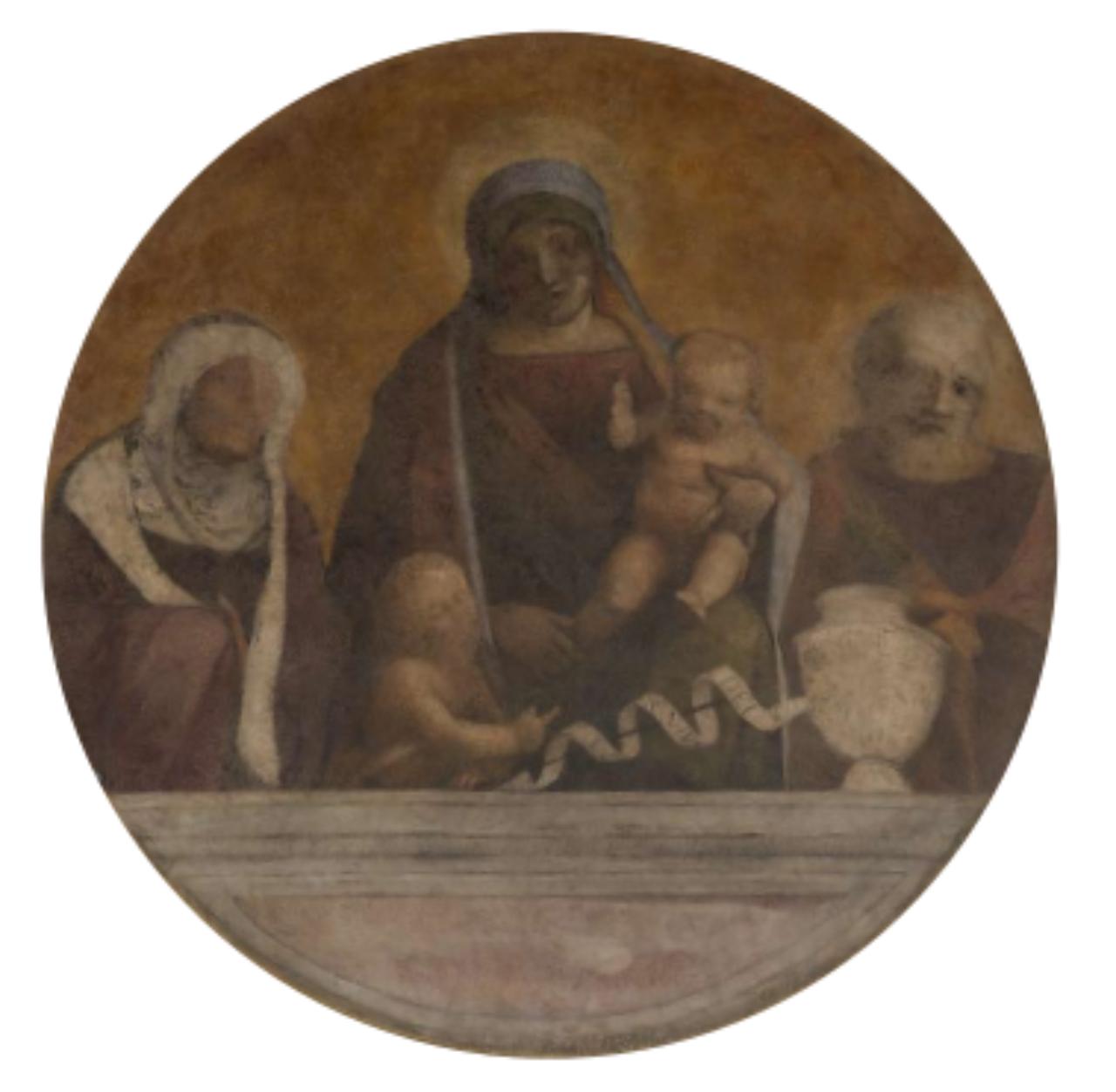 Personaggi: Madonna, Gesù Bambino, San Giuseppe, santa (Elisabetta? Anna?), San Giovanni Battista. Oggetti: crocetta di canne con il cartiglio "Ecce agnus dei".