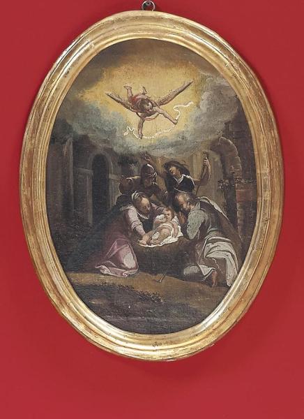 Personaggi: Sacra Famiglia, pastori, angelo con cartiglio del "Gloria". Paesaggio: architettura ad archi.