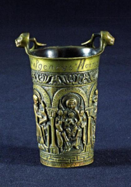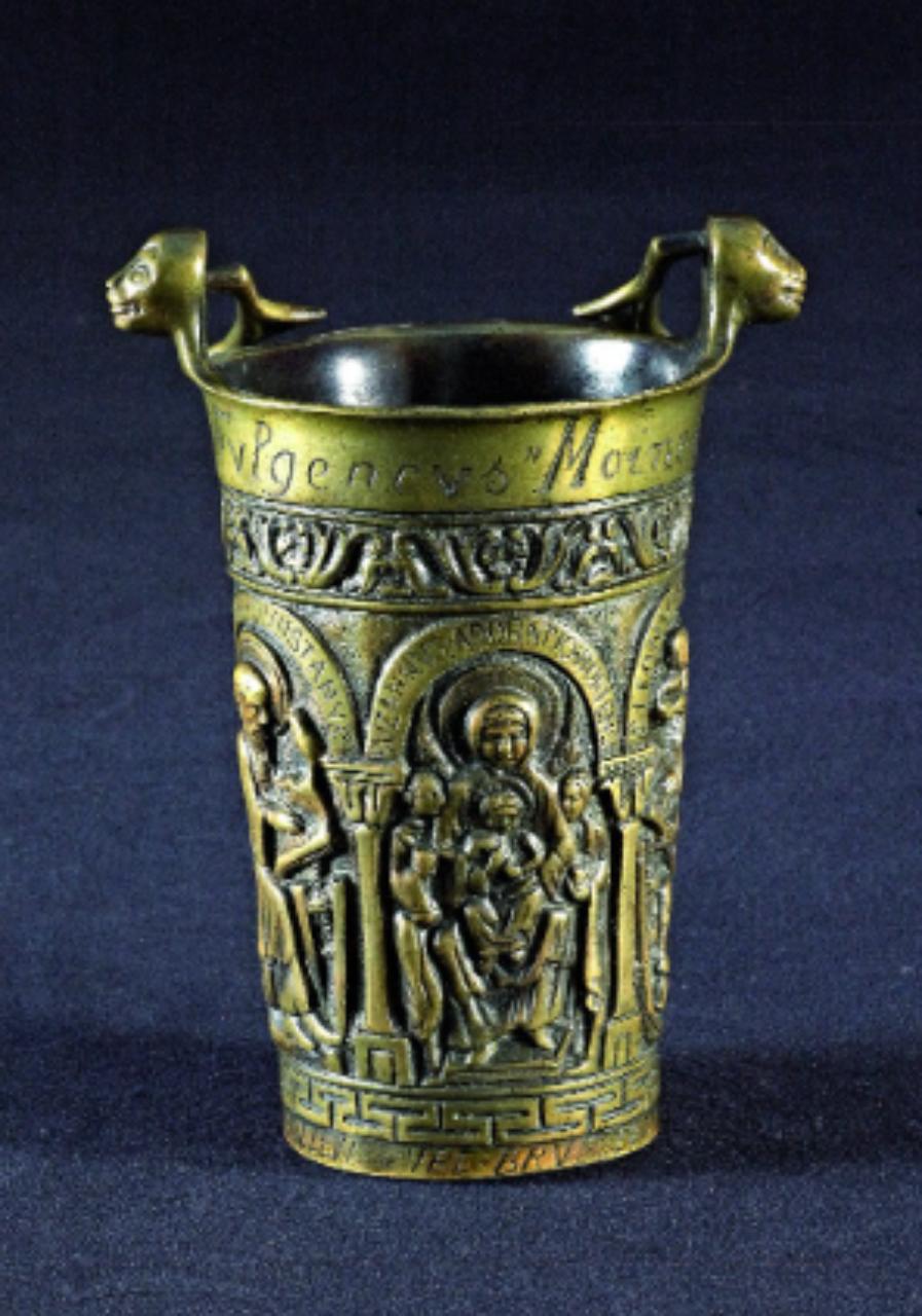 Fregi e incisioni: base circolare con fregio a motivi geometrici, arcatelle con iscrizioni e colonnine, santi e Madonna con Bambino in trono, fascia con motivi a riccioli e foglie, teste di leone come reggi manico. Iscrizioni: "1670 fvlgencvs Moine Prieur de N+d+S.te Gvdule; SVZANNUS ADORATIO HORTENSI; S. LEONUS B. B.; S. ABRAHAM; S. VENERAND; S. TRAVALIS; S. PETRUS EREMITA; S. ISIDORUS DVNSTANUS".